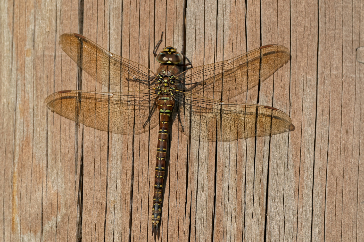 Linnaeus, 1758Trata-se de uma libélula de grande porte que pode atingir os 80 mm de comprimento total. No macho, o fundo do tórax é escuro com largas faixas antehumerais amarelo-esverdeadas. O abdómen é negro com marcas azuis em cada segmento; verifica-se um estreitamento abdominal muito pronunciado entre os segmentos S1 e S3. Os olhos são azulados. A fêmea, mais robusta, tem o tórax castanho com faixas antehumerais amareladas, mais curtas que as do macho. O abdómen é castanho, com marcas amarelas em cada segmento; verifica-se um estreitamento abdominal entre os segmentos S1 e S3, mas menos pronunciado. Tem os olhos acastanhados. Ambos os sexos têm asas transparentes com pterostigmas compridos e castanhos, mais claros no caso da fêmea. As patas são negras. Existem fêmeas andromórficas. Voa de Junho a Setembro.