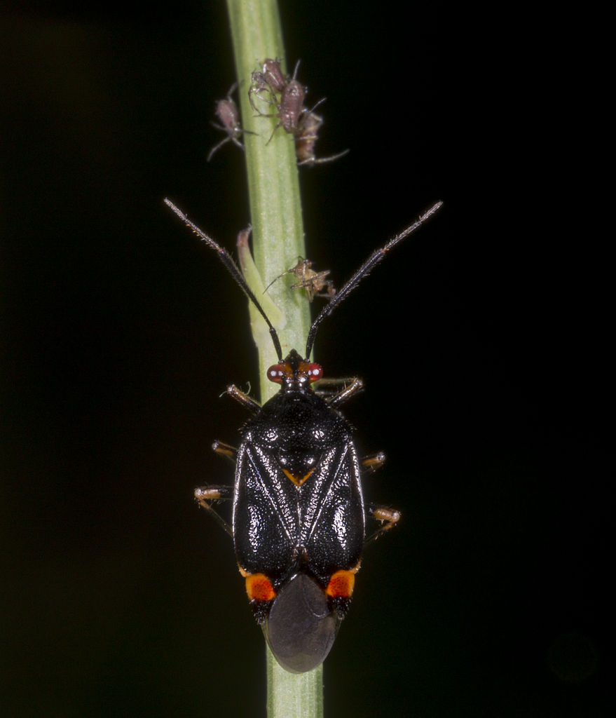 (Linnaeus, 1758)Trata-se de um percevejo com 6 a 8 mm de comprimento. O corpo exibe várias colorações, quer com predominância do laranja e castanho, quer do preto. Em todos os casos, a extremidade dos élitros, o cúneo, é vermelho. Nas antenas, dos 4 artículos, o 1.º e a base do 2.º, são pretos. Os fémures são bicolores. É uma espécie zoófaga: alimenta-se de pequenos insetos como afídios e pequenas larvas. Monovoltina. Hiberna em ovo. Os adultos podem ser observados de Julho a Setembro.