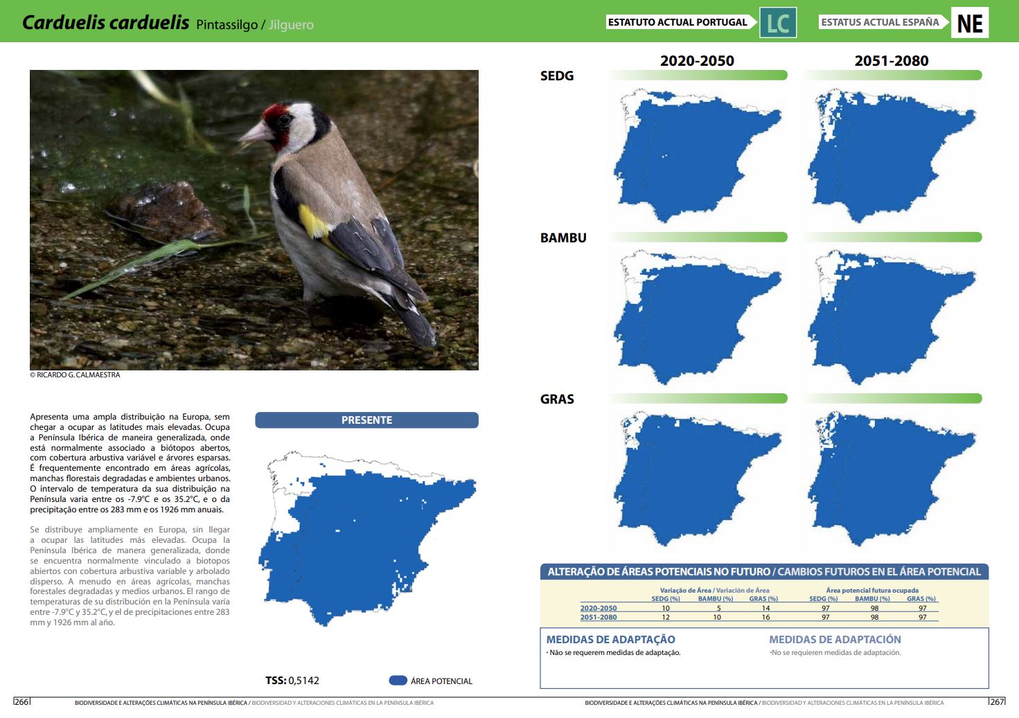 Previsão do impacte das alterações climáticas sobre a área de distribuição potencial do Carduelis carduelis na Península Ibérica, até ao ano de 2080 (clicar na imagem para ver em maior resolução).