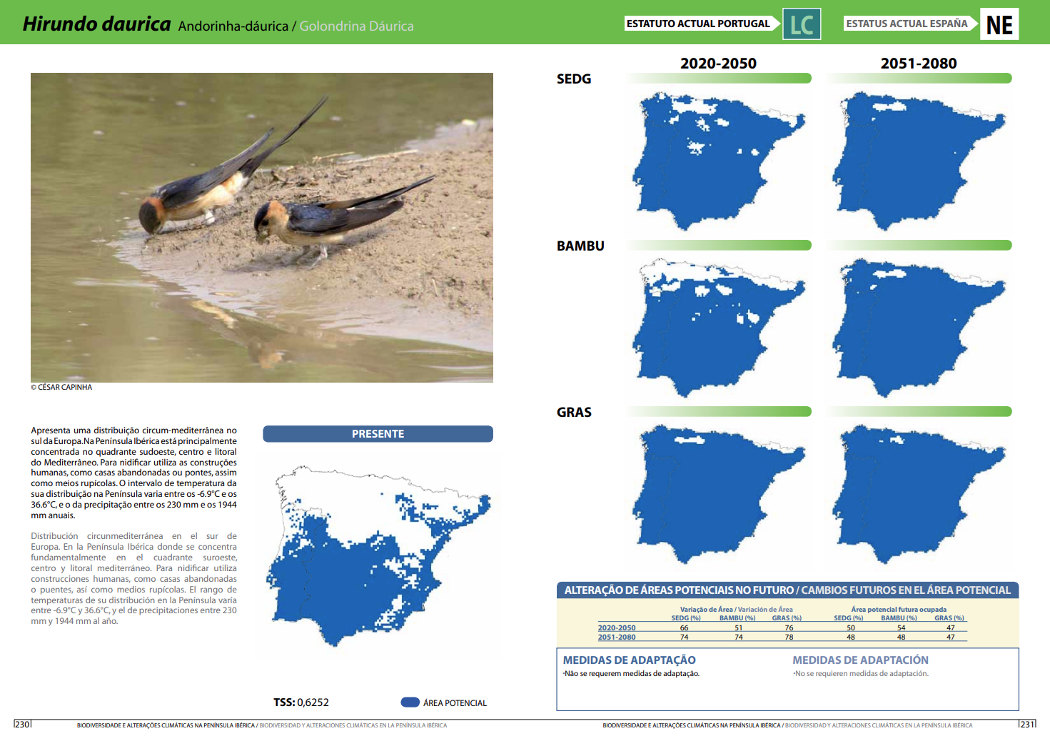Previsão do impacte das alterações climáticas sobre a área de distribuição potencial da Cecropis daurica na Península Ibérica, até ao ano de 2080 (clicar na imagem para ver em maior resolução).
