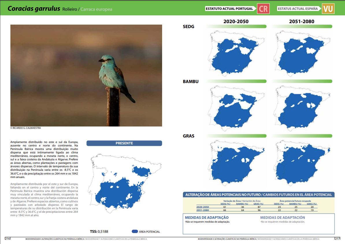 Previsão do impacte das alterações climáticas sobre a área de distribuição potencial do Coracias garrulus na Península Ibérica, até ao ano de 2080 (clicar na imagem para ver em maior resolução).