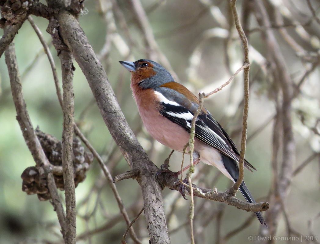 É uma ave que apresenta dimorfismo sexual. O macho tem um barrete cinzento-azulado, faces cor-de-tijolo e peito rosado/avermelhado. A fêmea tem uma plumagem mais clara, acastanhada e na nuca apresenta tonalidades cinzentas. As asas são pretas e brancas. Ambos possuem barras alares brancas e duplas. O bico é robusto e de tons metálicos nos machos, sendo mais claro nas fêmeas.