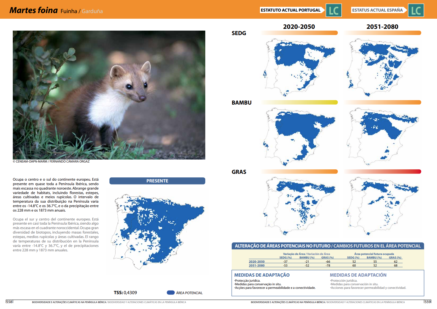 Previsão do impacte das alterações climáticas sobre a área de distribuição potencial da Martes foina na Península Ibérica, até ao ano de 2080 (clicar na imagem para ver em maior resolução).