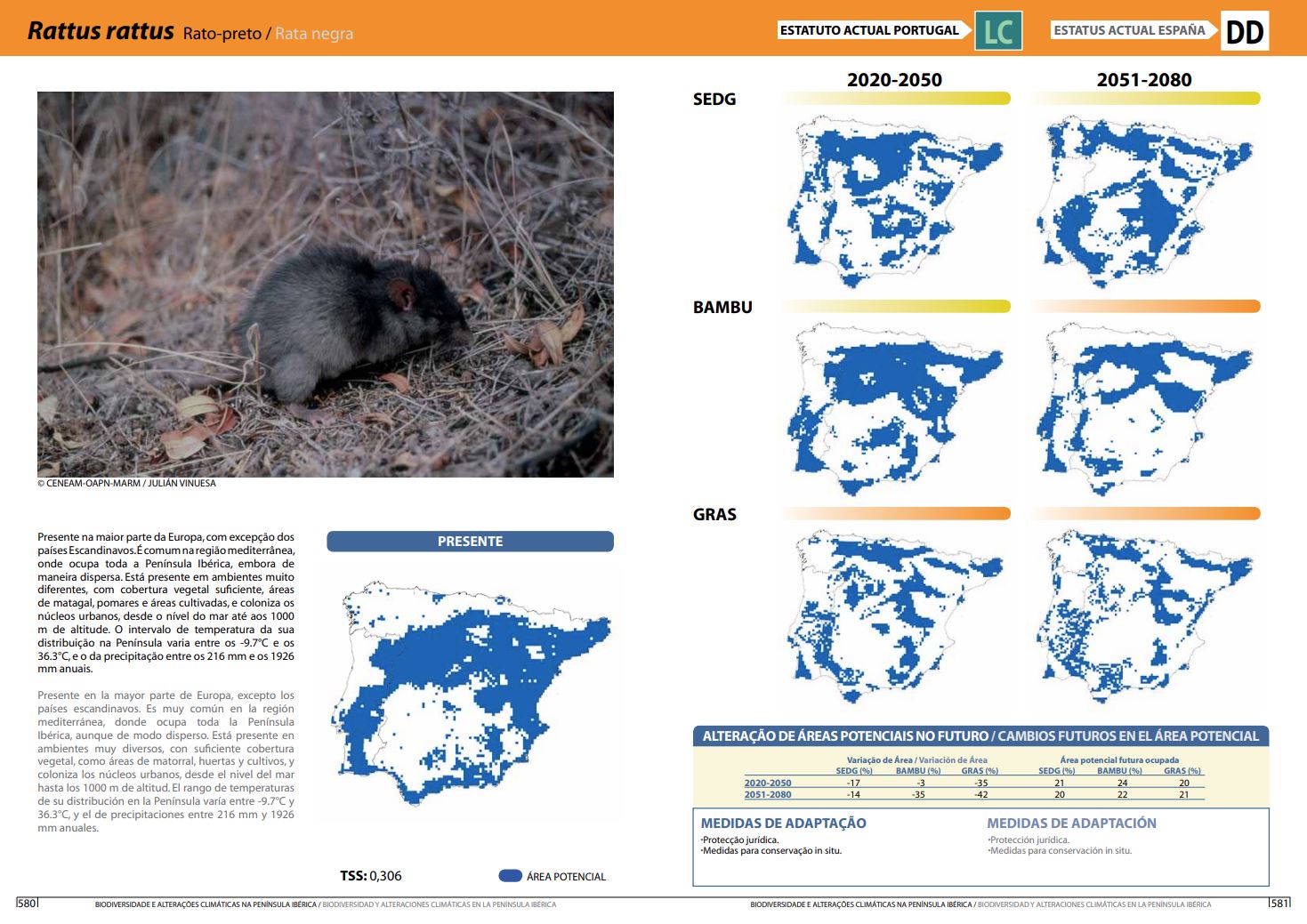 Previsão do impacte das alterações climáticas sobre a área de distribuição potencial do Rattus rattus na Península Ibérica, até ao ano de 2080 (clicar na imagem para ver em maior resolução).