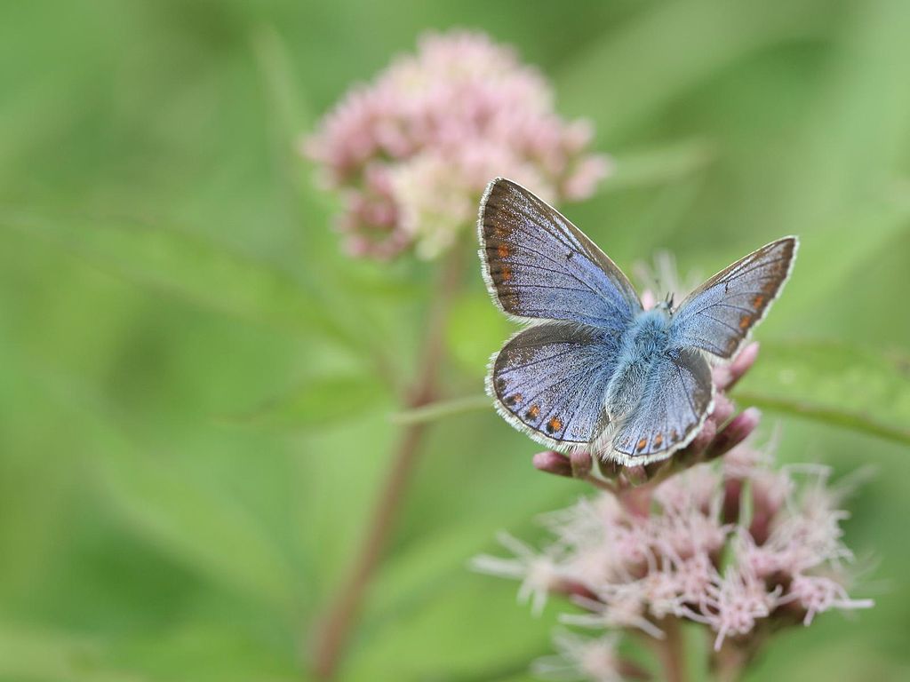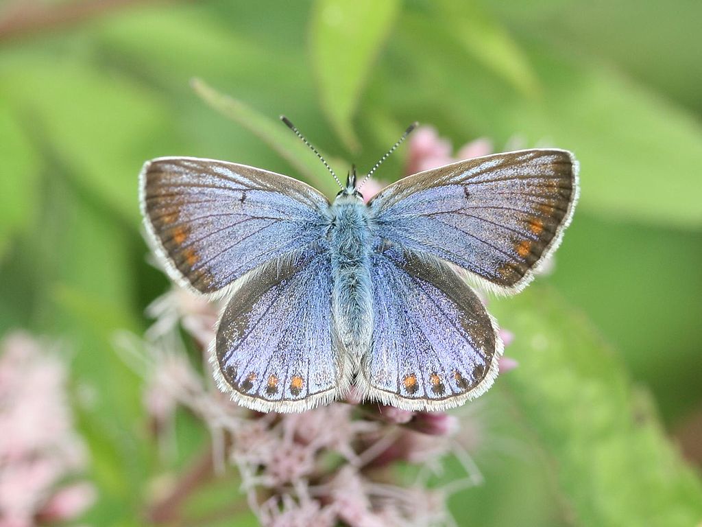 (Rottemburg, 1775)Trata-se de uma borboleta com uma envergadura de asa entre 28 e 36 mm. No macho, a face superior das asas é azul-violácea brilhante, com um rebordo fino e preto, e banda marginal branca. A fêmea tem a face superior das asas maioritariamente acastanhada, com uma quantidade variável de azul, exibindo ainda lúnulas laranjas marginais. A face inferior das asas é creme e ambos os sexos exibem uma sequência de lúnulas laranja nas margens (8 a 9 nas asas posteriores, mais marcadas e numerosas do que nas anteriores), assim como vários ocelos pretos com rebordo branco, distribuídos por toda a superfície (habitualmente, 12 nas asas posteriores, e 8 a 9 nas anteriores). Corpo com tonalidades azuladas; olhos negros; antenas com segmentos brancos e pretos alternados.