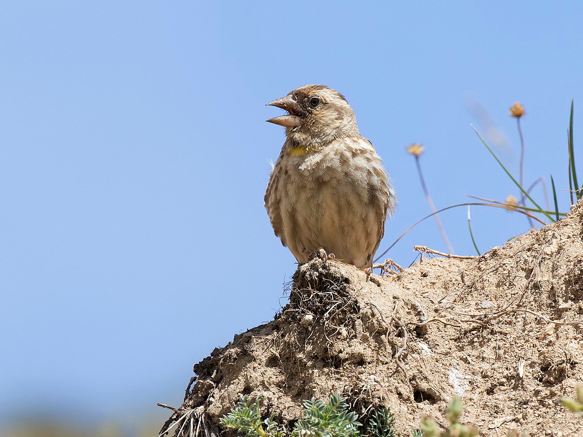 (Linnaeus, 1766)Trata-se de uma ave muito semelhante à fêmea de pardal-dos-telhados (Passer domesticus), distinguindo-se desta, essencialmente, pela característica mancha amarela na garganta (por vezes, difícil de observar), assim como pela listra supraciliar na cabeça, bem mais pronunciada. Apresenta uma coloração quase homogénea, entre o castanho-claro e o bege, exibindo um padrão malhado no dorso. Nas zonas peitoral e ventral apresenta uma plumagem mais pálida. Tem o bico claro, cónico e grosso, característico das aves granívoras. Na cauda, destacam-se umas pintas brancas nas rectrizes, visíveis quando em voo. As patas são rosadas.