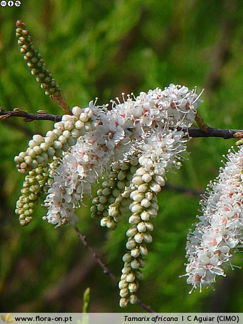 PoiretÁrvore ou arbusto perenifólio, até 6 m de altura. Ramos: largos e flexíveis, com ritidoma pardo ou purpúreo. Folhas: alternas, escamiformes, sésseis, com limbo agudo até 3 mm, uniformemente verde escuro, com a margem membranosa semitransparente. Inflorescências: cachos espiciformes, cilíndricos com 5 – 8 mm de diâmetro, geralmente assentes nos ramos grossos do ano anterior; flores brancas ou rosa-pálido (2 a 3 mm), corola com 5 pétalas. Floresce de Março a Junho.